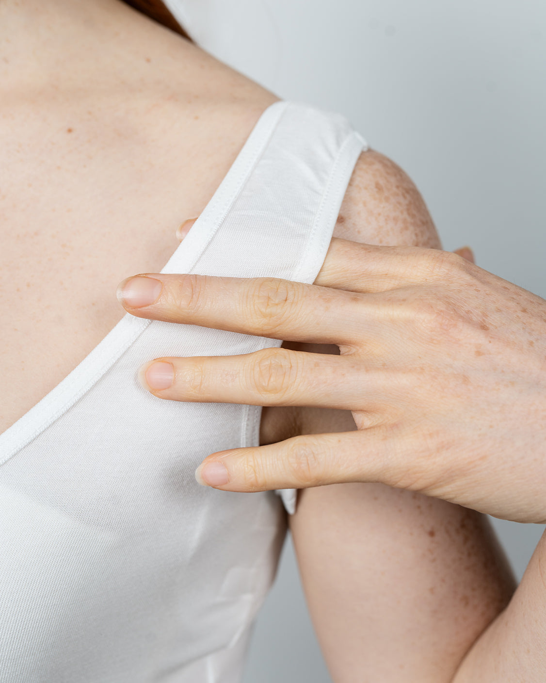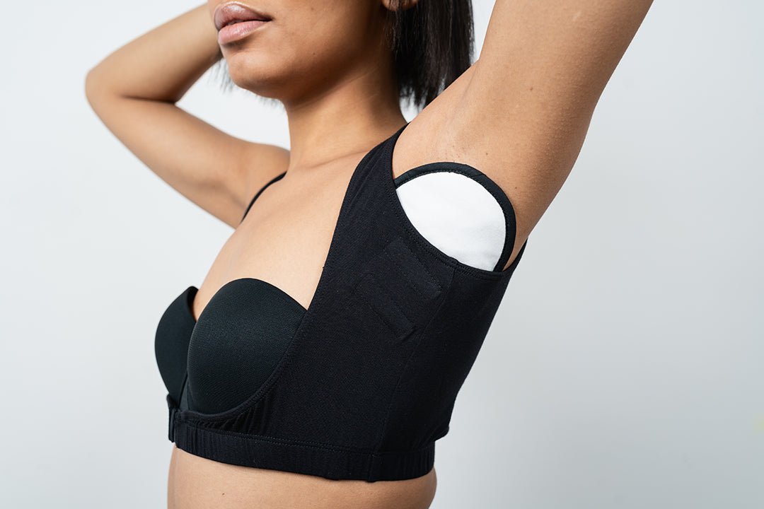 Our breathable undergarment is designed to be worn over your bras*. It comes with a set of patent-pending, detachable underarm sweat shields which absorbs underarm sweat, preventing moisture, odor, and deodorant stains from affecting your favorite tops.