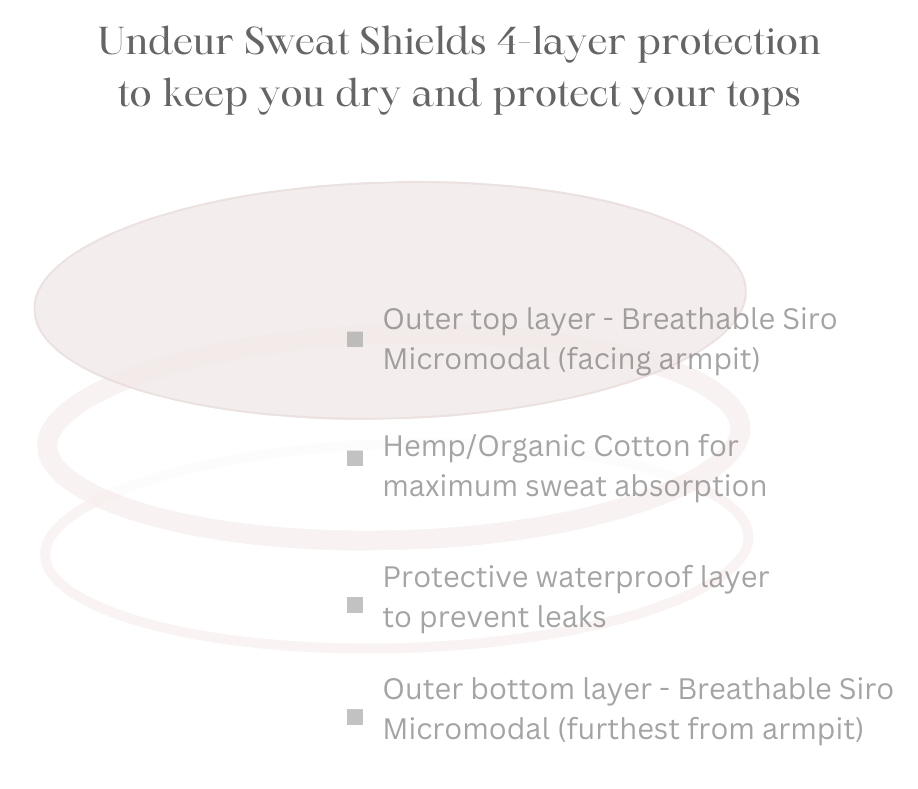 Undeur's patent pending sweat shields are secured with two velcro pads making it easy to remove and replace, helping you reduce that laundry load!